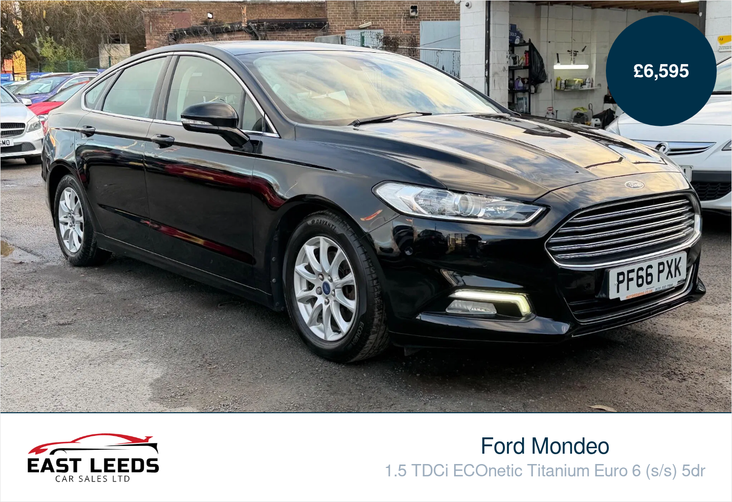 This 2016 Ford Mondeo TDCi Titanium boasts a recent service in November 2025 at 87,645 miles, offering peace of mind with its partial service history and a 6 month warranty. This Euro 6 compliant 1.5 litre diesel model comes in the well appointed Titanium trim, featuring dual zone electronic automatic climate control and independent rear air conditioning for all passengers. Parking is made easier with front and rear parking sensors, while automatic headlights ensure optimal visibility. Experience impressive efficiency with this Mondeo, achieving a remarkable 79 mpg, which is significantly better than many other vehicles in its class. Its low CO2 emissions further contribute to its economical running costs. You'll also appreciate the generous boot space, perfect for luggage or shopping. This Car Will Come Fully Valeted & Ready to Go To Its New Owner. Any Inspection Welcome, Part Exchange Welcome. ZERO Deposit Low Rate Finance Packages Are Available On This Car. FREE 6 Months Warranty. East Leeds Car Sales has been open and trading from the same location for over 15 years. With lots of repeat customers returning to us over the years. Please give us a call with any inquiry you may have
