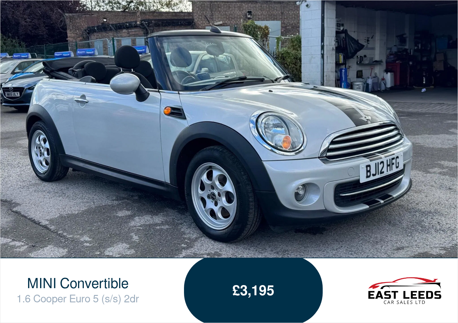 🚗🌟 Get ready to embrace the thrill of open-air driving with the stunning MINI Convertible 1.6 Cooper Euro 5 at East Leeds Car Sales! This sleek Silver beauty is not just about looks; it’s packed with features that make every journey unforgettable! 🎉 With a **Full Service History** and a recent service, you can hit the road with confidence. Enjoy the convenience of **Keyless Start**, **Electric Windows**, and **Mirrors**, plus the comfort of **Air Conditioning**—perfect for those sunny days! ☀️💨 Feel the wind in your hair as you effortlessly open the **fully working power roof** and navigate tight spaces with the help of **Rear Parking Sensors**. And let’s not forget about those eye-catching **15" Alloy Wheels**! 🚙✨ With **2 keys**, an **MOT until 01/12/2026**, and a **FREE 6-month warranty**, you’re getting exceptional value. 💼👍 Plus, our flexible **ZERO Deposit Low Rate Finance Packages** make ownership a breeze. This car comes fully valeted and ready for its new owner—might it be you? Don’t miss out! Visit us at East Leeds Car Sales today and let’s make your MINI dreams come true! 🌈🎈